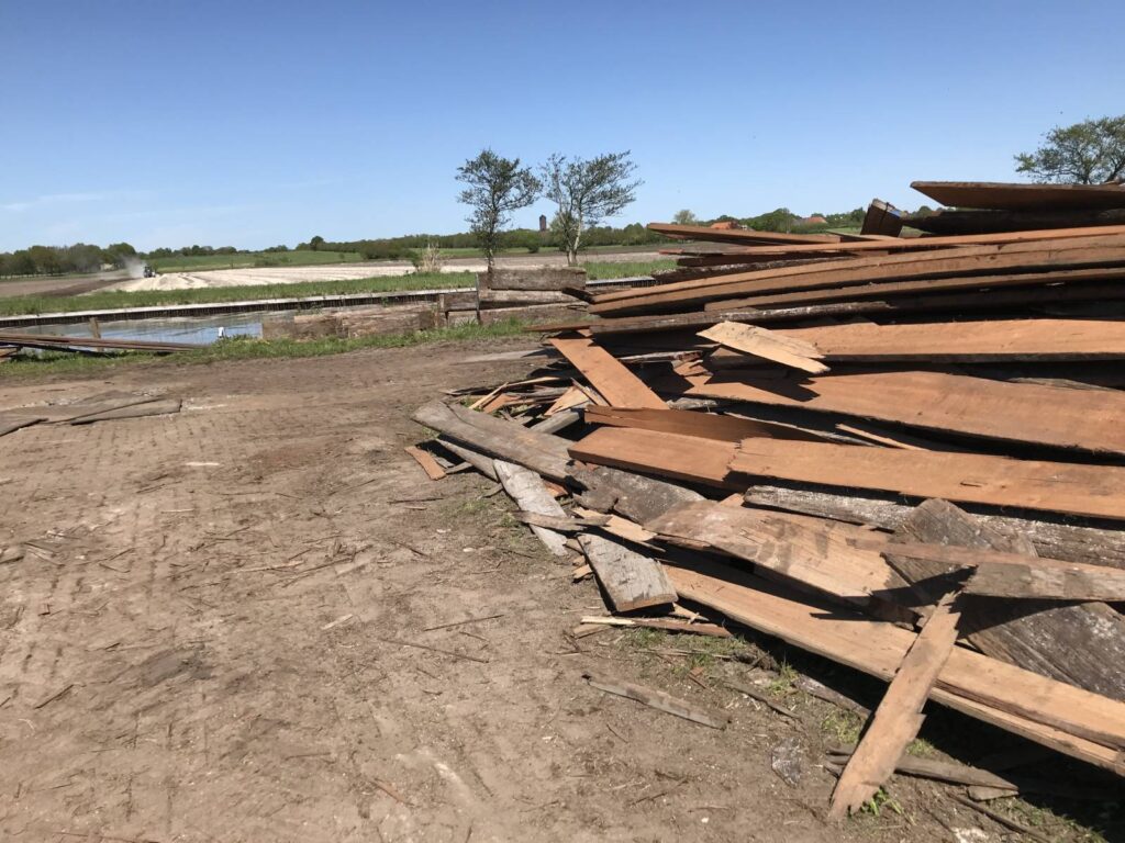 Op de werkplaats aangekomen worden alle planken schoongemaakt en droog weg gezet. Ook dat is een enerverend werk omdat de planken vaak dik onder de modder, klei en schelpen zitten. Het duurt wel een paar maanden voor het hout zo droog is dat we het kunnen verwerken.